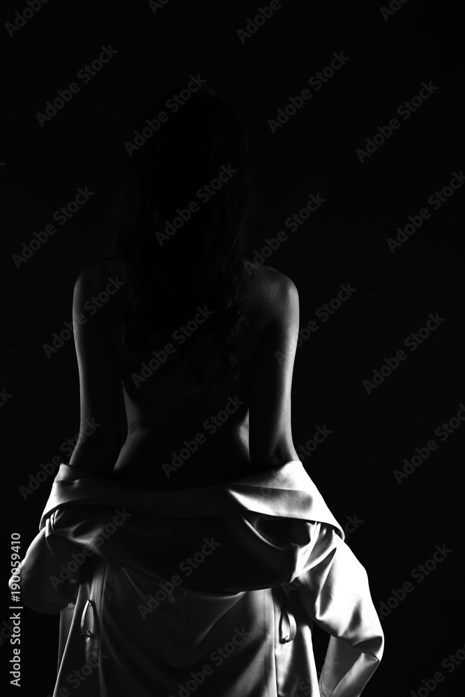 Body of Woman with black panty turn body without bra and beast to show side rear view, concept black white low key exposure silhouette.