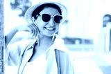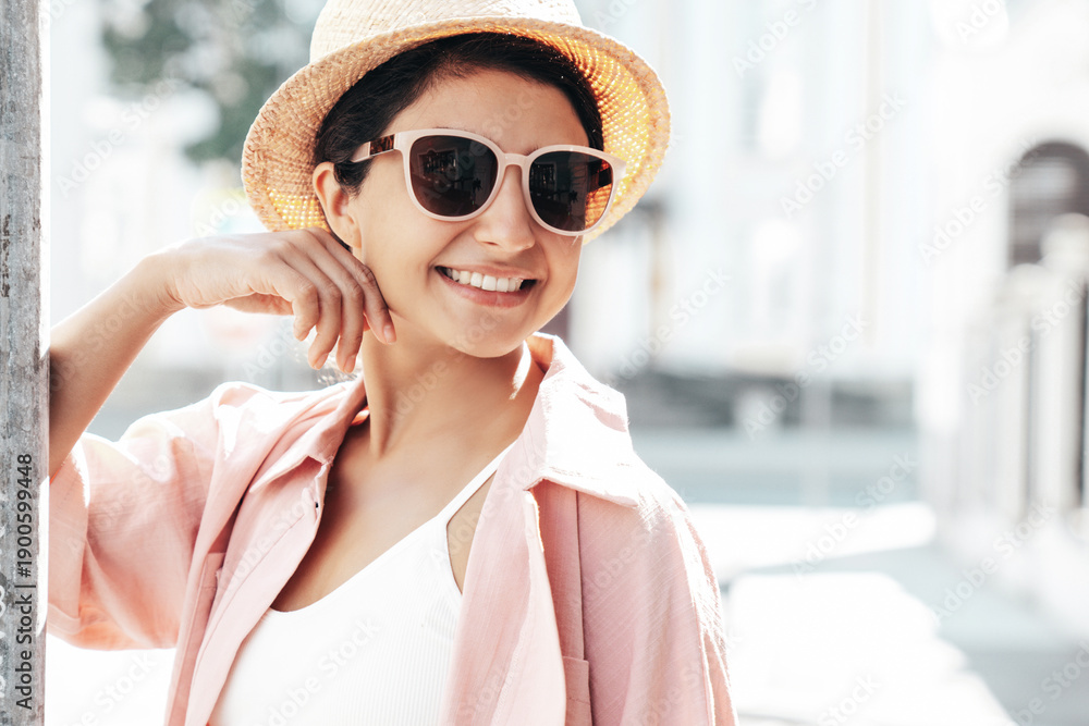 Young beautiful smiling hipster woman in trendy summer pink costume clothes. Carefree female posing in the street at sunny day. Positive model outdoors at sunset. Cheerful and happy in hat, sunglasses