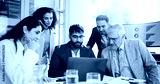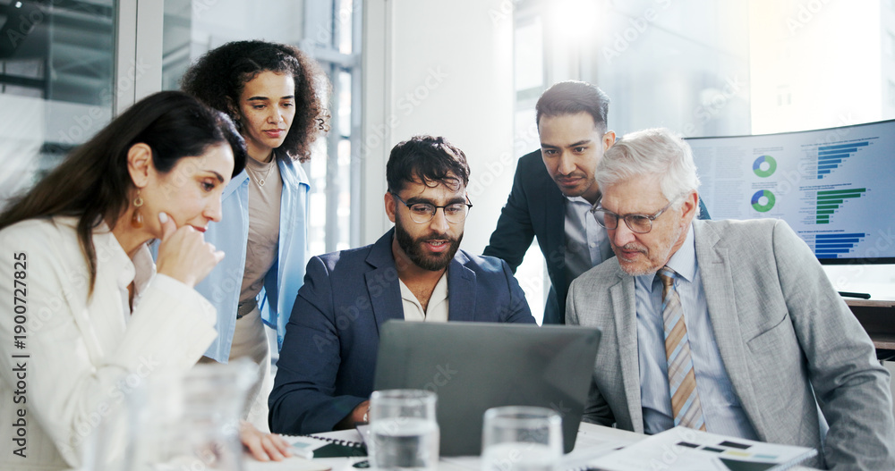 Business people, laptop and analytics with team in office for corporate analysis or statistics. Group, employees or colleagues with computer for company performance review or development in workplace