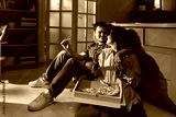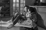 Young couple sitting on floor eating pizza together, smiling and looking at each other, open pizza box resting on woman's lap