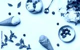 Flat-lay of Pink strawberry and coconut ice cream scoops, sweet cones, peony flowers bouquet and fresh berries in bowl over white background, top view, copy space. Summer food concept