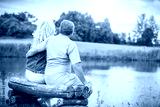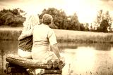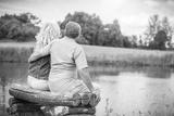 Older marriage sitting together on a bench by the lake.