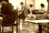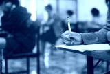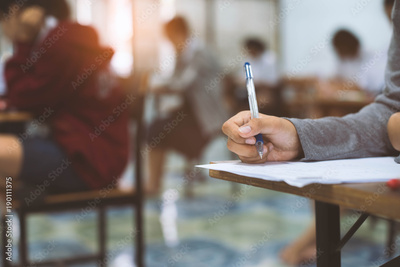 Close up to hand of student holding pen and taking exam in classroom with stress for education test.