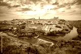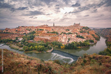 Panorama of Old city of Toledo and river Tajo in the overcast day, Castilla La Mancha, Spain