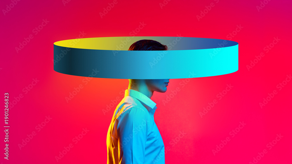 Vivid mixed media circular halo male head portrait. Concept of personal branding, digital identity, modern technology themes, creative advertising visuals, and futuristic editorial design.