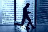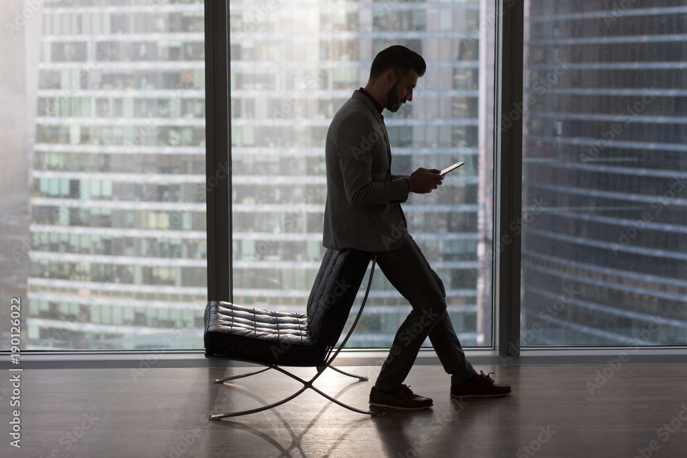 Businessman with a tablet in his hands is standing near a window with a view of the city.