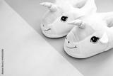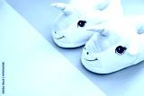 pop art pair of fluffy white unicorn slippers on pastel colour background