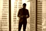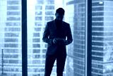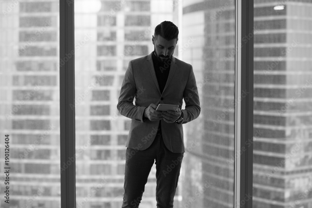 Businessman with a tablet in his hands is standing near a window with a view of the city.