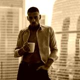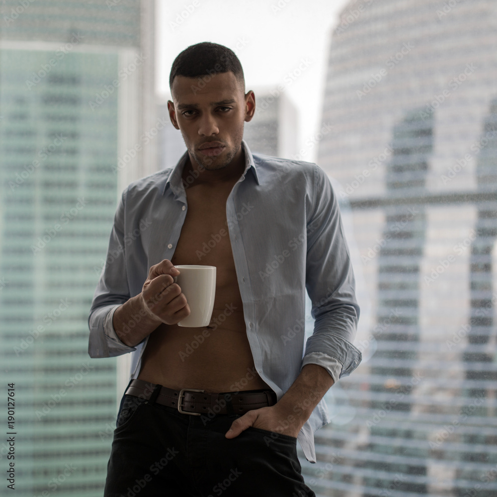 A businessman drinks a morning coffee before the work. Panoramic windows background.