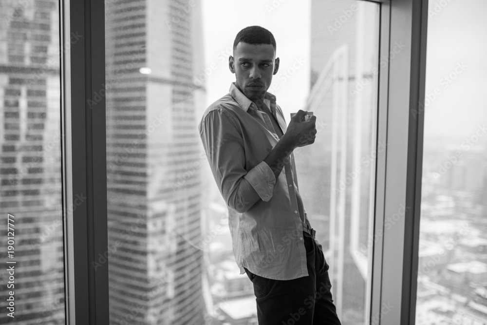 A businessman drinks a morning coffee before the work. Panoramic windows background.