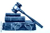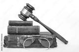 Three Antique Worn Leather Bibles with Gavel and Antique Glasses on White Background