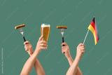 Male hands with glass of cold beer, Germany flag and traditional sausages on green background. Octoberfest celebration