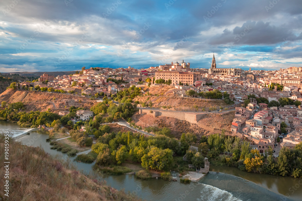 Panorama of Old city of Toledo and river Tajo in the overcast day, Castilla La Mancha, Spain