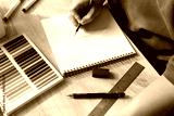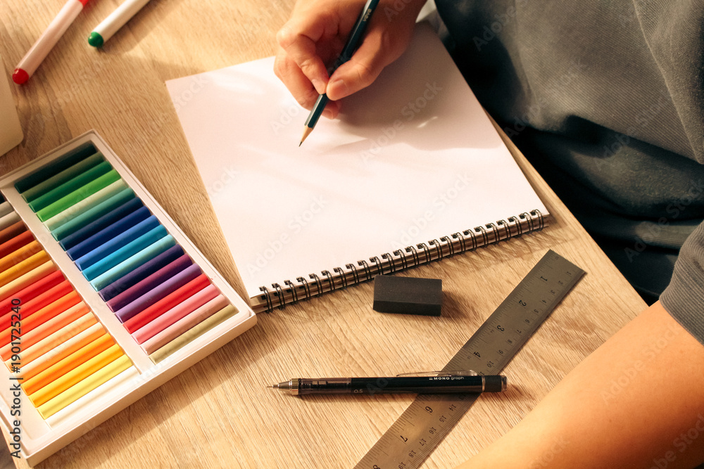 Close up of student hand starting to draw on blank sketchbook, artist workspace with oil pastels and tools for art education.