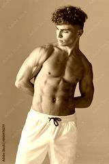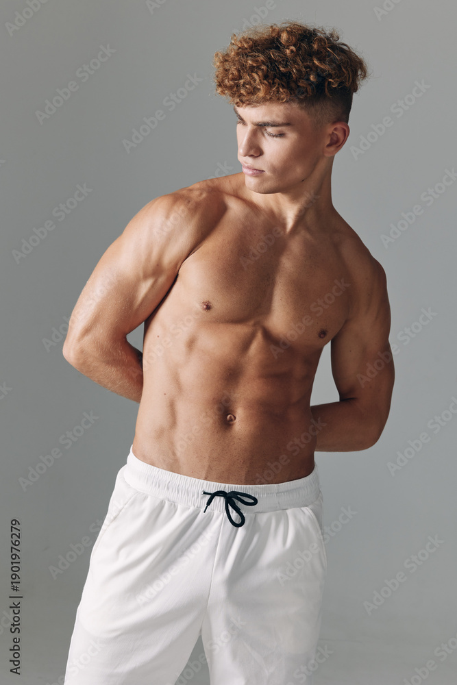 Young muscular man standing shirtless with white pants on gray background showing athletic body and defined muscles with curly hair and pleasant facial expression