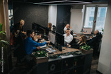 A team of professionals collaborates at multiple desks with computer screens in a contemporary office.