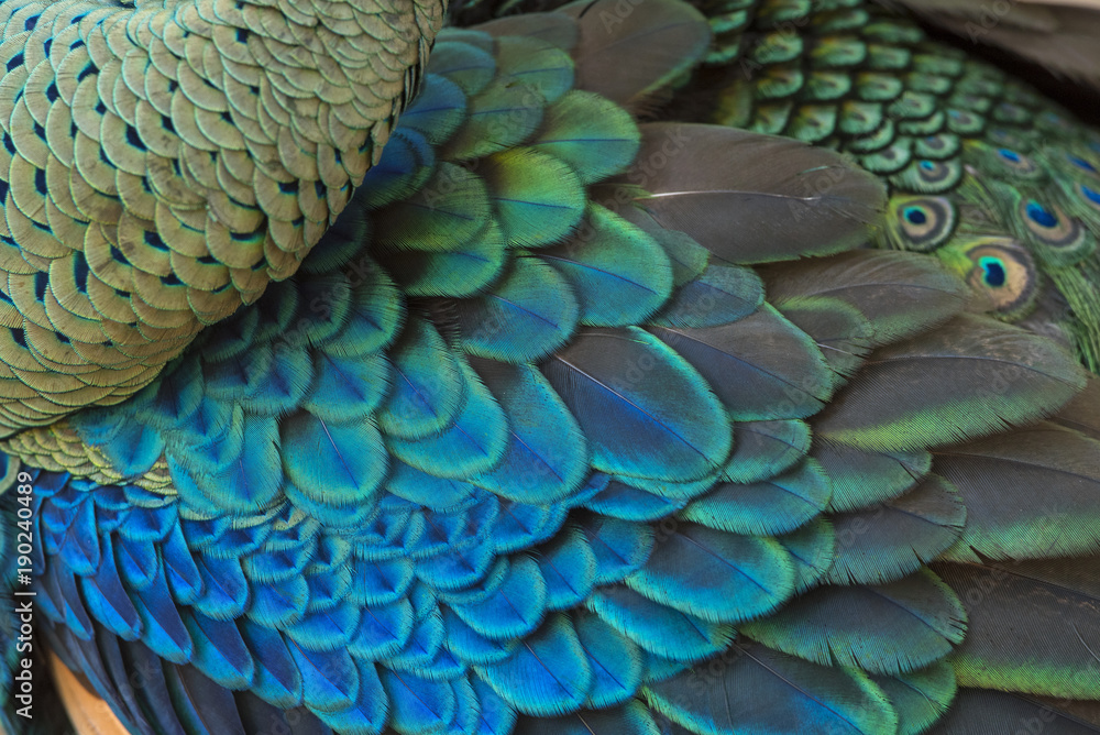 closeup peacock feathers (Green peafowl)