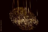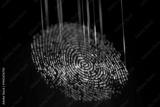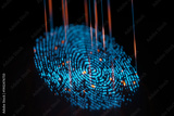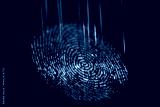 futuristic 3D digital fingerprint made of glowing blue particles. Vertical light rays scan the surface, representing advanced biometric security, AI data processing, and identity verification.