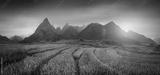 Rice fields on terraced with Mount Fansipan background at sunset in Lao Cai, Northern Vietnam. Fansipan is a mountain in Vietnam, the highest in Indochina.