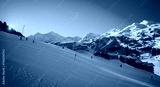 The first skiers on the slopes of ski resort Meribel - Mottaret, part of Les 3 vallees, France.
