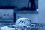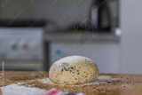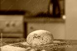 Closeup of ball ready dough on floured kitchen table. Defokus in the background.