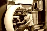 Transportation vehicles. Semi trucks vehicle. Hispanic man trucker. Handsome man driver in front of truck. Trucking owner. Truck driver. Man trucker driver near lorry truck. Vehicle repair