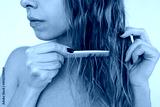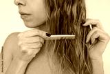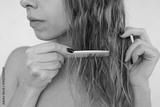 Young blonde woman combing wet hair with a comb. Hair care routine after shower, natural beauty, healthy hair, minimal skincare concept, close up, white studio background