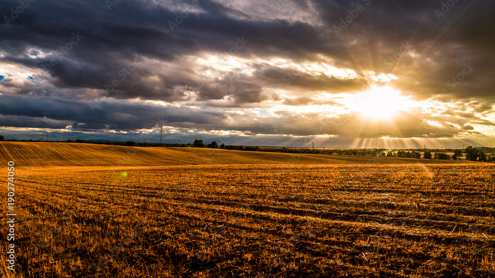 sunset in dry meadow in the pasture