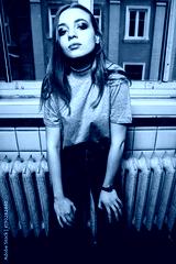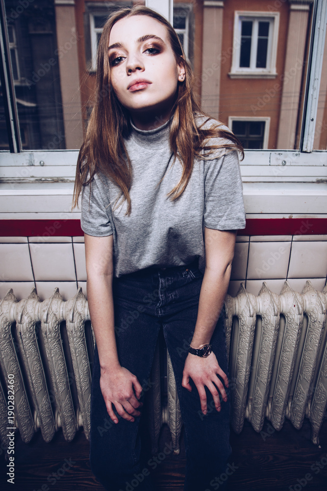 Fashion portrait of beautiful girl wearing casual clothes and looking at the camera. Indoors