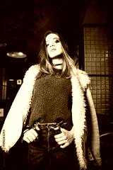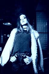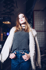 Fashion portrait of beautiful young girl in stylish outfit posing at the camera in modern cafe.