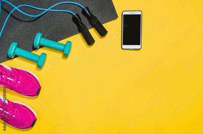 Fitness accessories, healthy and active lifestyles concept background with copy space for text. Products with vibrant, punchy pastel colours and frame composition. Image taken from above, top view.