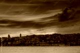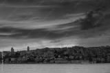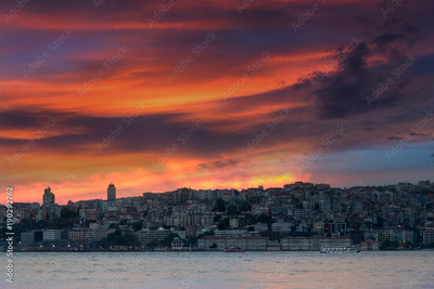 Landscape of Istanbul at sunset. View of dramatic cloudy sky and lights business district from sea. Turkey.