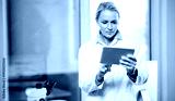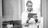 Woman, scientist and typing with tablet at laboratory, notes and medical research for nipah virus. Mature person, equipment and tech with app for pharma innovation, checklist and vaccine development