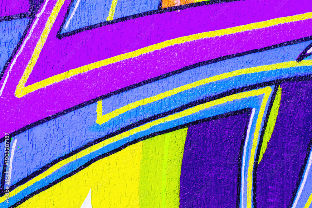 Abstract graffiti art with purple, yellow, blue neon colors. Urban 90s style pattern, fluorescent glow, bold shapes. Background texture, banner, flyer, web site.