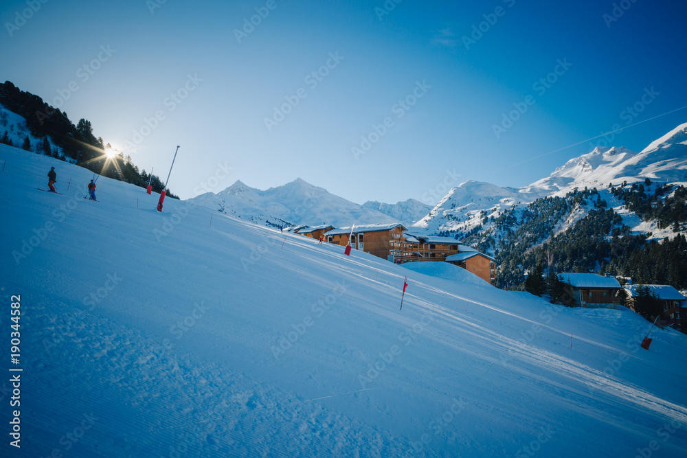 The first skiers on the slopes of ski resort Meribel, part of Les 3 vallees, France.