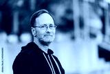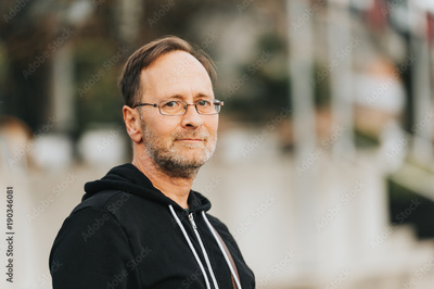 Outdoor portrait of 50 year old man wearing black hoody and eyeglasses