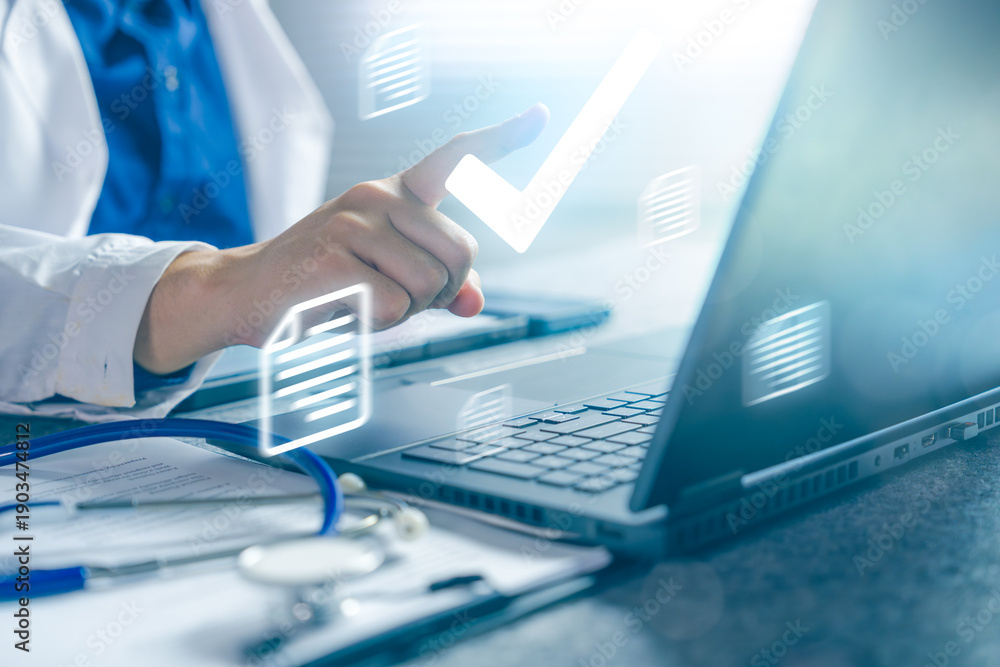 Doctor Approving Medical Documentation on Laptop with Digital Healthcare Workflow and Clinical Decision Concept