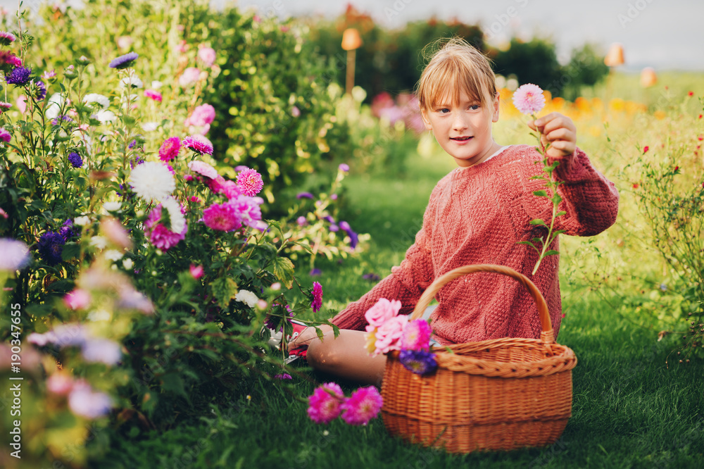 Pretty little girl working in autumn garden, child taking care of colorful chrysanthemum, gardener teenager enjoying warm and sunny day