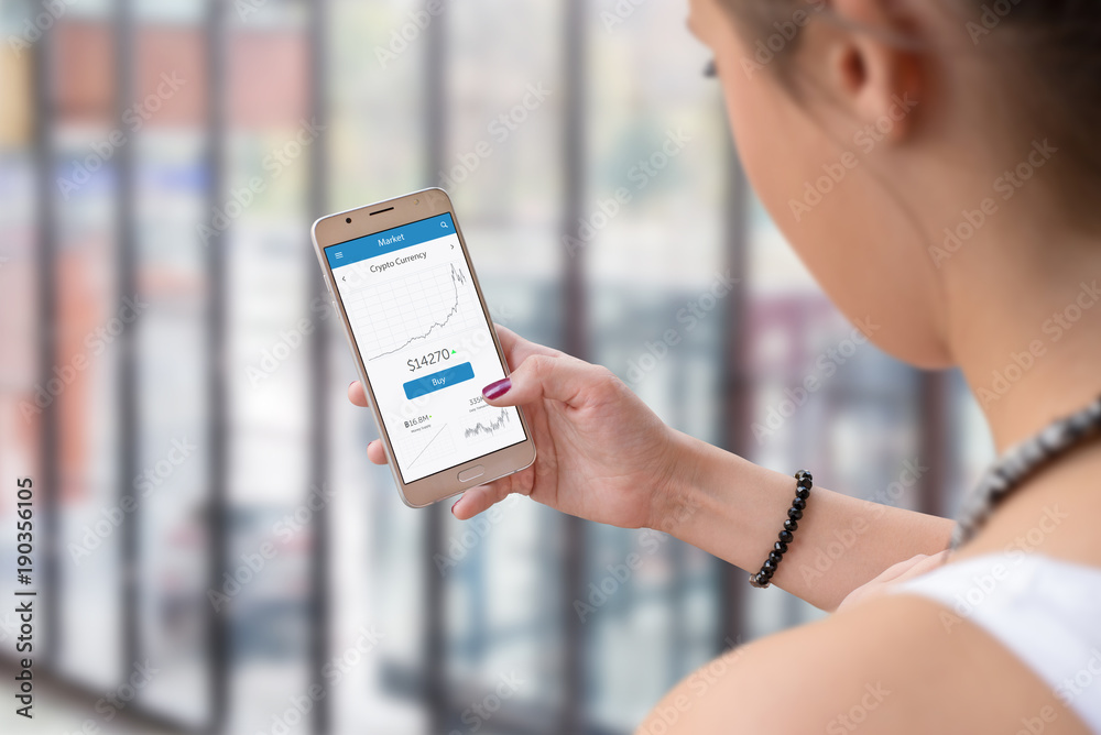 Cryptocurrency stats on mobile app screen with buy button. Business ceneter in background...