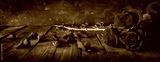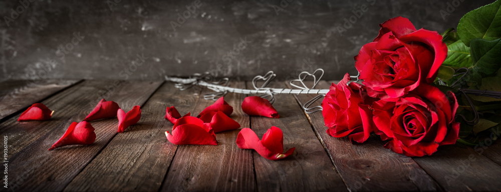 Red roses with petals and heart shapes on rustic wooden boards in front of a slate. Vintage background for valentine's day greetings. Horizontal banner for a love concept with space for text.