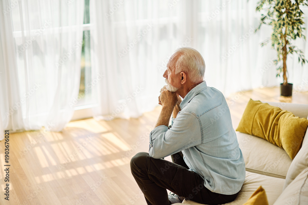 Portrait of a serious sad mature old man at home