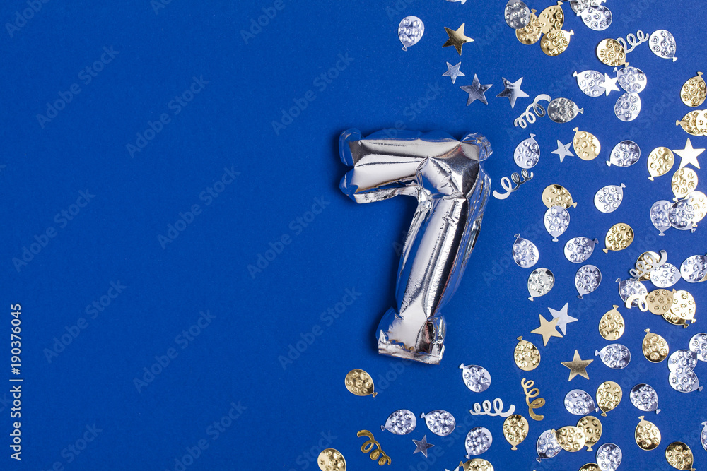 Silver foil number 7 balloon on a blue background with glitter gonfetti