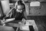 Woman reviewing household bills at home kitchen table