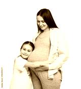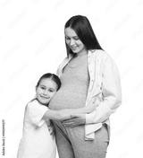 Pregnant woman and her daughter on white background