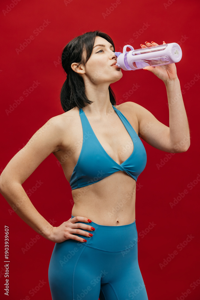 Healthy lifestyle scene with sporty woman drinking water on isolated background.