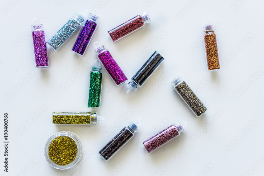Close-up bottles of colorful glitter for makeup and manicure. Concept fashion and beauty.