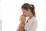 Mother, holding her sick baby boy, sad baby, isolated on white
