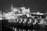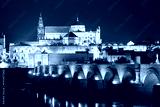 Illuminated Great Mosque Mezquita - Catedral de Cordoba with mirror reflection and Roman bridge across Guadalquivir river during evening blue hour, Cordoba, Andalusia, Spain