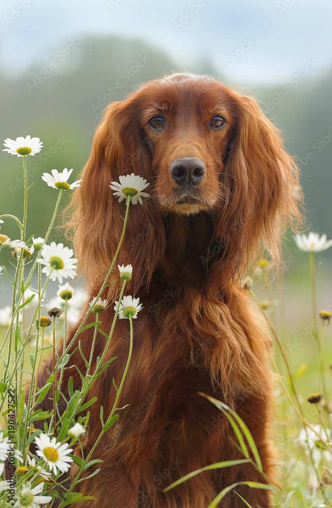 Dog portrait, irish setter in flowers, outdoors, vertical