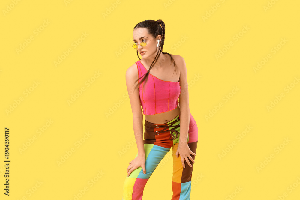 Pretty young woman with braids in earphones dancing on yellow background